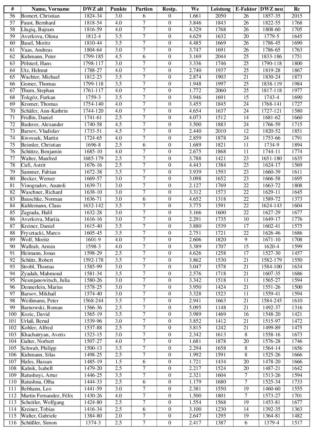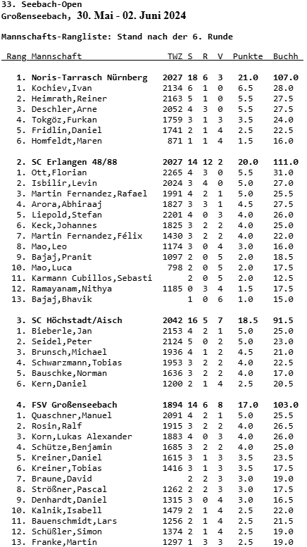 Turniersieger nach sieben Runden: Ivan Kochiev (SC Noris-Tarrasch Nürnberg), mit 6,5 Punkten. Auf den zweiten Platz und Gewinner des Sparkassen-Sonderpreises landet Florian Ott (SC Erlangen 28/88). Dritter wird Kevin Narr (SG Donautal Tuttlingen).