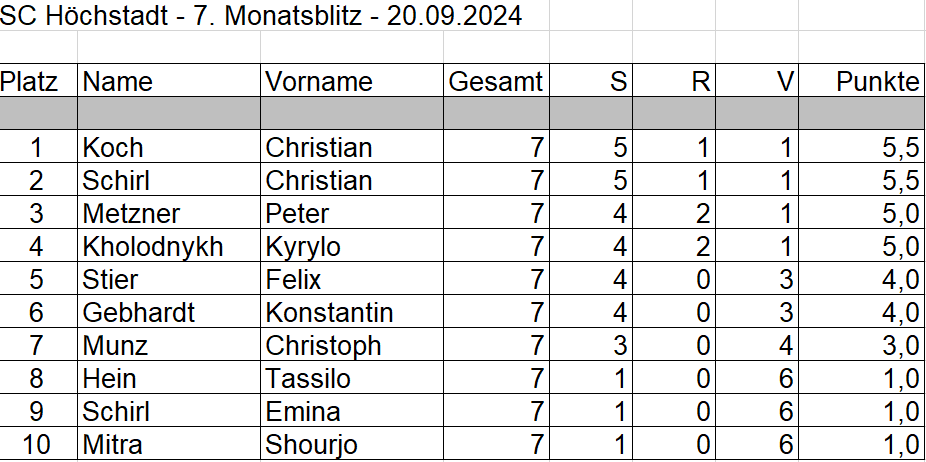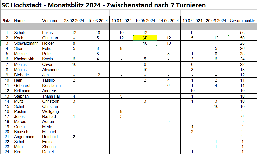 Das siebte Monatsblitzturnier 2024 fand am Freitag, den 20.09.24 statt. Es gewann Christian vor Christian, und zwar Christian Koch vor Christian Schirl Punktgleich, nur durch die Feinwertung getrennt.